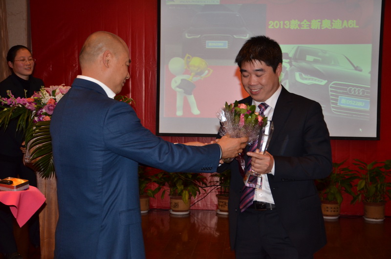 聚会盛大表扬了公司历史上首个年度董事长卓越孝顺奖和年度董事长优异孝顺奖,药品销售公司总司理王军民获得年度董事长卓越孝顺奖,上虞腾博tengbo9885官网总司理朱志斌和总司理助理周林获得年度董事长优异孝顺奖,董事长吕钢亲自宣读颁奖词,并为他们揭晓奖品,年度董事长卓越孝顺奖奖品为2013款全新奥迪A6L,年度董事长优异孝顺奖奖品为欧米茄De ville 2013新款手表。
